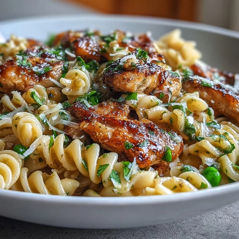 If you want to make this even richer, stir in a few tablespoons of heavy cream along with the pasta water. I do this when I want the dish to feel a little more indulgent, and it turns the sauce silky without overwhelming the garlic and lemon. You can also swap the chicken for rotisserie meat if youre short on time, just shred it and toss it in with the peas.
